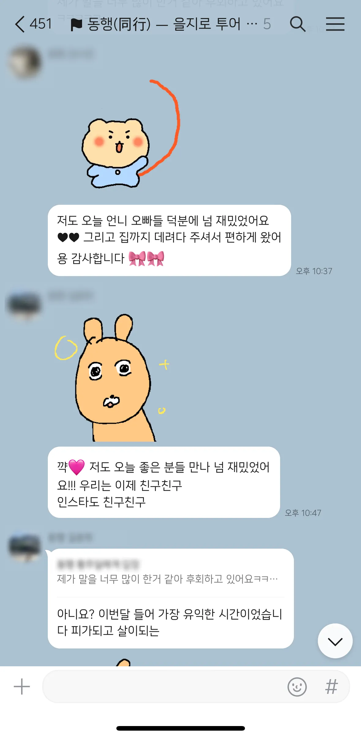 동행은 계속 됩니다! 각자의 현생도 열심히 살고 있는 사람들의 만남이니까요. 다음날 일정을 위해 기분 좋게 마무리 하고, 좋았다면 다음에 또 만나 동행해요.